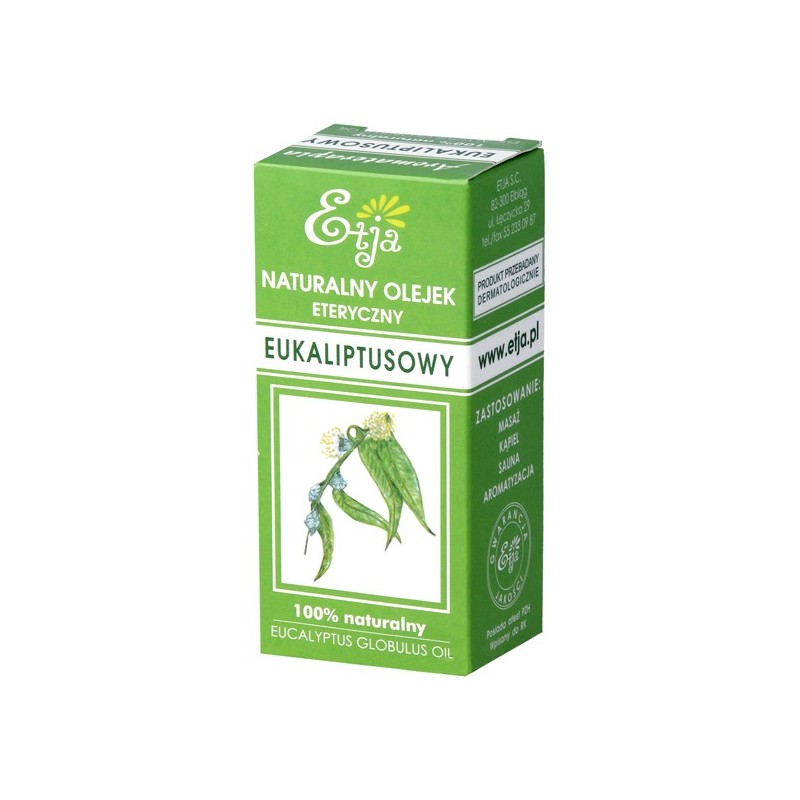 Olejek eteryczny eukaliptusowy marki Etja zaleca się stosować w masażu, kąpieli, saunie, parówkach twarzy i jako dodatek w pastach do zębów, syropach oraz sprayach na gardło. Można używać w rozcieńczeniu z olejem bezpośrednio na skórę lub do aromatyzacji pomieszczeń.