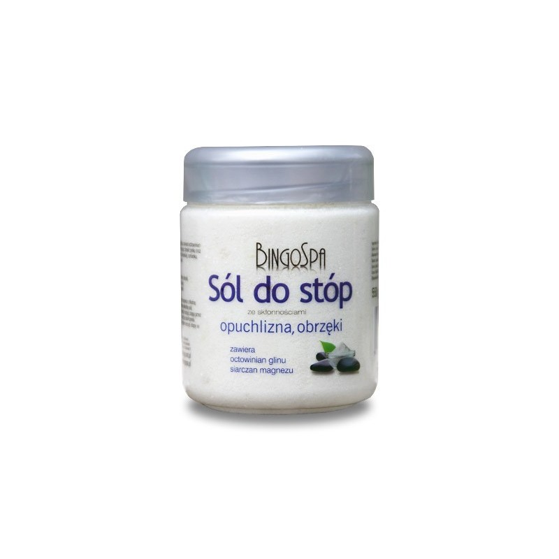 Sól do stóp BingoSpa zawiera octowinian glinu, siarczan magnezu, tlenek cynku oraz wyciągi z lawendy lekarskiej, rumianku, krwawnika i szałwii. Łagodzi opuchliznę i obrzęki, odświeża i tonizuje oraz zmiękcza