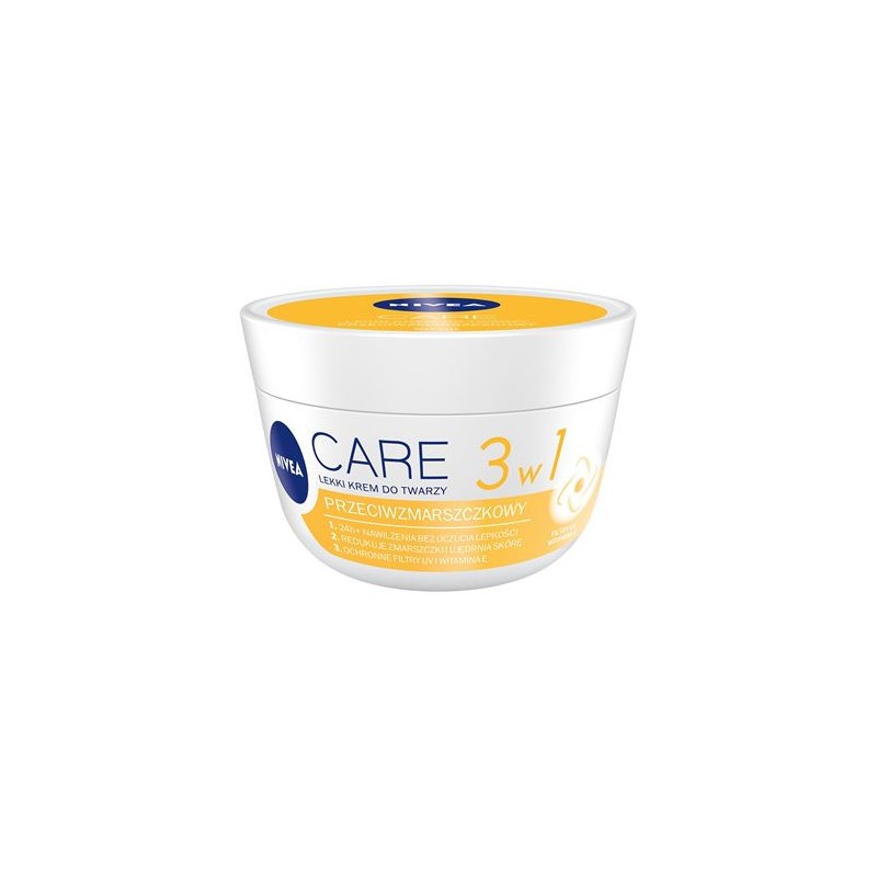 NIVEA Care 3w1 Przeciwzmarszczkowy Lekki krem do twarzy jest przeznaczony do każdego typu cery. Stworzony z myślą o tym, by dzięki cennej Witaminie E oraz Filtrom UV chronić skórę i dbać o utrzymanie jej młodego wyglądu na dłużej, każdego dnia! Formuła kremu dodatkowo zawiera innowacyjne hydrowoski, które błyskawicznie rozpuszczają się po kontakcie ze skórą. Zatopione w lekkim kremie, zapewniają intensywne nawilżenie i odżywienie, bez uczucia lepkości. Formuła 3w1 dostarczy twojej skórze jeszcze więcej korzyści:
