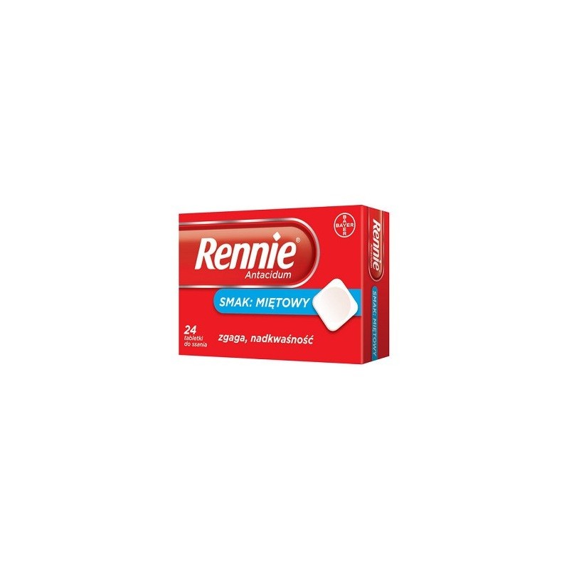 Rennie Antacidum tabletki do ssania o smaku miętowym w dolegliwościach związanych z nadkwaśnością soku żołądkowego.