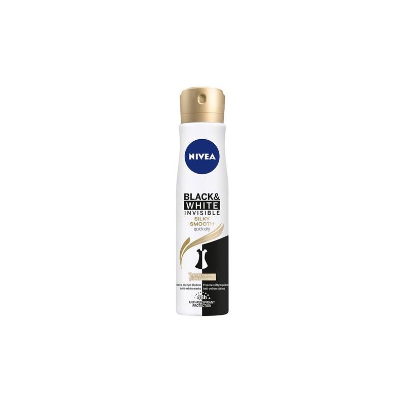 NIVEA® Antyperspirant Black&White Invisible Silky Smooth spray to produkt, który zapewni Ci skuteczną ochronę przed nadmiernym poceniem się dzięki unikalnej formule przez 48 godzin, bez ryzyka pobrudzenia ubrań. Pozostawia uczucie jedwabiście gładkiej, miękkiej skóry, nawet przy codziennym goleniu.