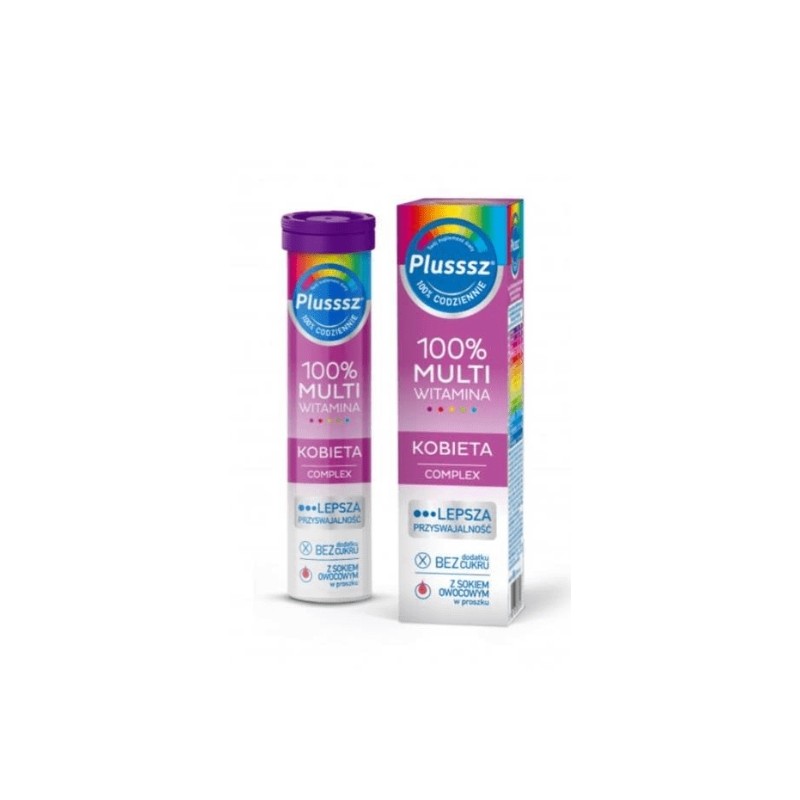 Plusssz 100% Multiwitamina Kobieta Complex - suplement diety zawierający w swoim składzie ekstrakt ze skrzypu polnego oraz ekstrakt z korzenia guggul. Produkt przeznaczony dla osób dorosłych.