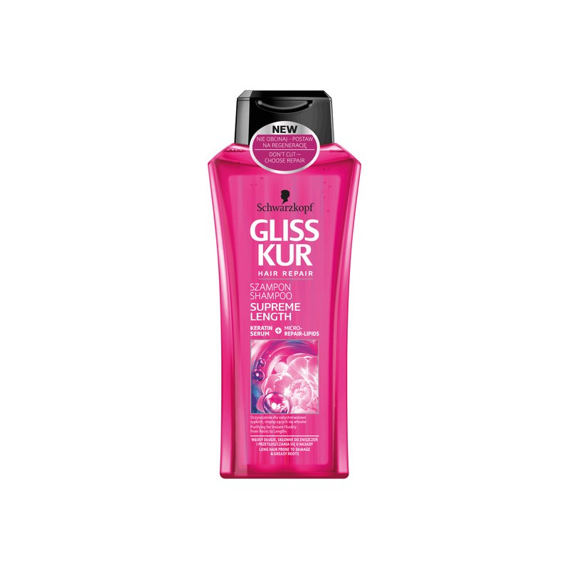 Gliss Kur Hair Repair Supreme Length szampon do włosów długich, skłonnych do zniszczeń, z rozdwajającymi się końcówkami. Zawarte formuły w szamponie Gliss Kur Supreme Lenght z keratynowym serum efektywnie odbudowują powstałe zniszczenia i wzmacniają strukturę komórkową. Szampon zapobiega przyszłym uszkodzeniom. Jest idealny do regeneracji włosów długich, skłonnych do zniszczeń i rozdwajających się końcówek. Szampon Supreme Lenght z regeneracyjnymi mikro-lipidami i ekstraktem z piwonii usuwa nadmiar sebum u nasady i odbudowuje zniszczenia na długości włosów
