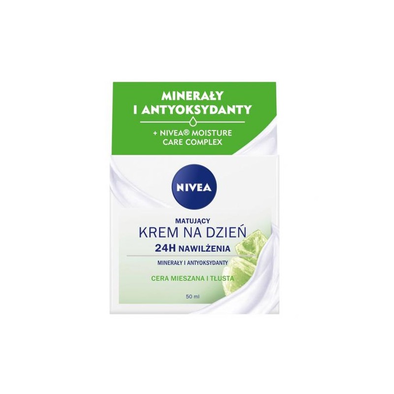 Nivea® Matujący Krem na Dzień 24H Intensywnego nawilżenia zawiera wyjątkową formułę Nivea® Moisture Care Complex, Minerały i Antyoksydanty. Intensywnie nawilża skórę do 24 godzin, przywracając naturalną równowagę i poziom nawilżenia skóry. Efektywna formuła redukuje poziom sebum i zapewnia matową cerę. Chroni skórę przed negatywnym wpływem czynników zewnętrznych i stresem oksydacyjnym.