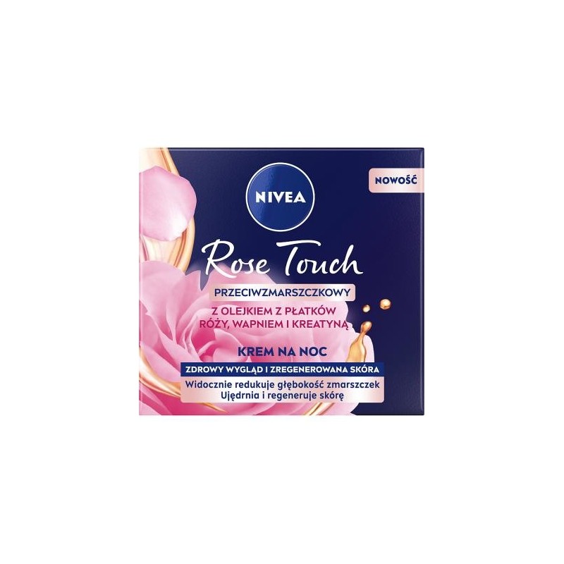 NIVEA ROSE TOUCH Przeciwzmarszczkowy krem na noc z olejkiem z płatków róży, wapniem i kreatyną widocznie redukuje głębokość zmarszczek sprawiając, że skóra wygląda zdrowo i jędrnie, intensywnie odżywia skórę w nocy, zapewniając uczucie zrelaksowanej skóry o poranku, ujędrnia i wygładza skórę oraz zapewnia skórze promienność i zdrowy, świeży wygląd. Jest wzbogacony Kreatyną, która stymuluje komórki do produkcji własnego kolagenu*. Dla zdrowo wyglądającej, promiennej cery. Jest odpowiedni dla wszystkich typów skóry.