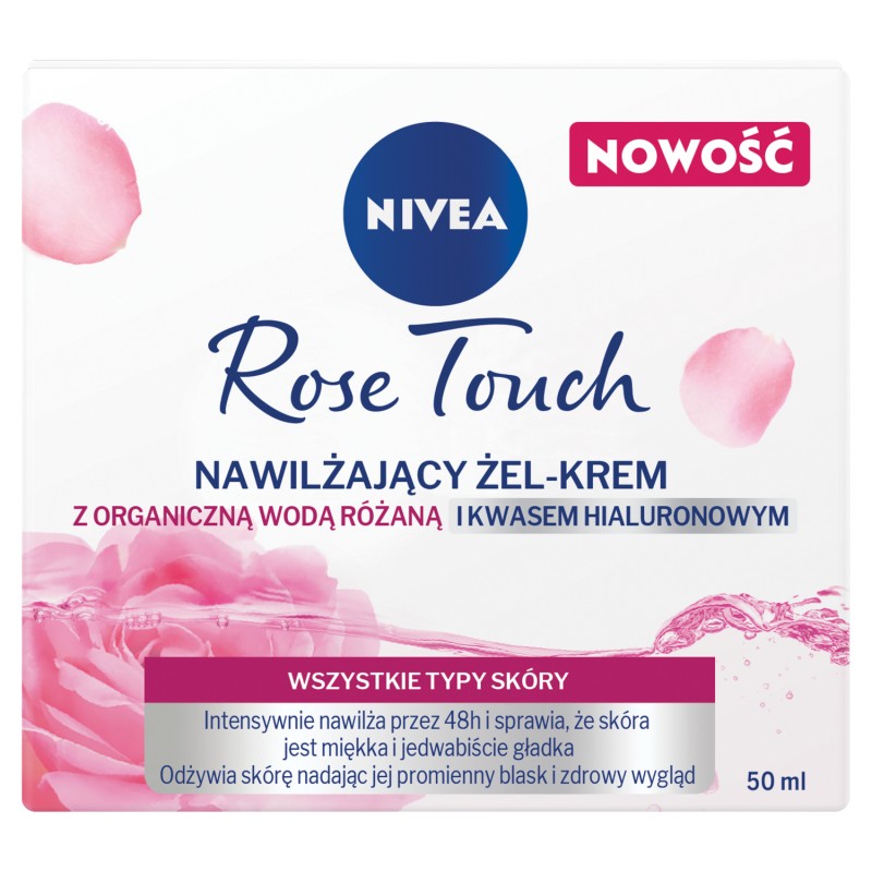 Poznaj wyjątkową formułę żelowego kremu do twarzy NIVEA Rose Touch z bogatą w witaminy organiczną wodą różaną i kwasem hialuronowym! Nawilżający żel-krem do twarzy szybko się wchłania, nie pozostawiając na skórze uczucia lepkości. Wyjątkowa formuła łącząca organiczną wodę różaną i kwas hialuronowy zapewnia skórze intensywne, 48-godzinne nawilżenie. Nadaje cerze promienny blask oraz sprawia, że wygląda zdrowo. Efekt: miękka i jedwabiście gładka skóra, która zachwyca promiennym blaskiem i zdrowym wyglądem każdego dnia! Tolerancja dla skóry potwierdzona dermatologicznie.
