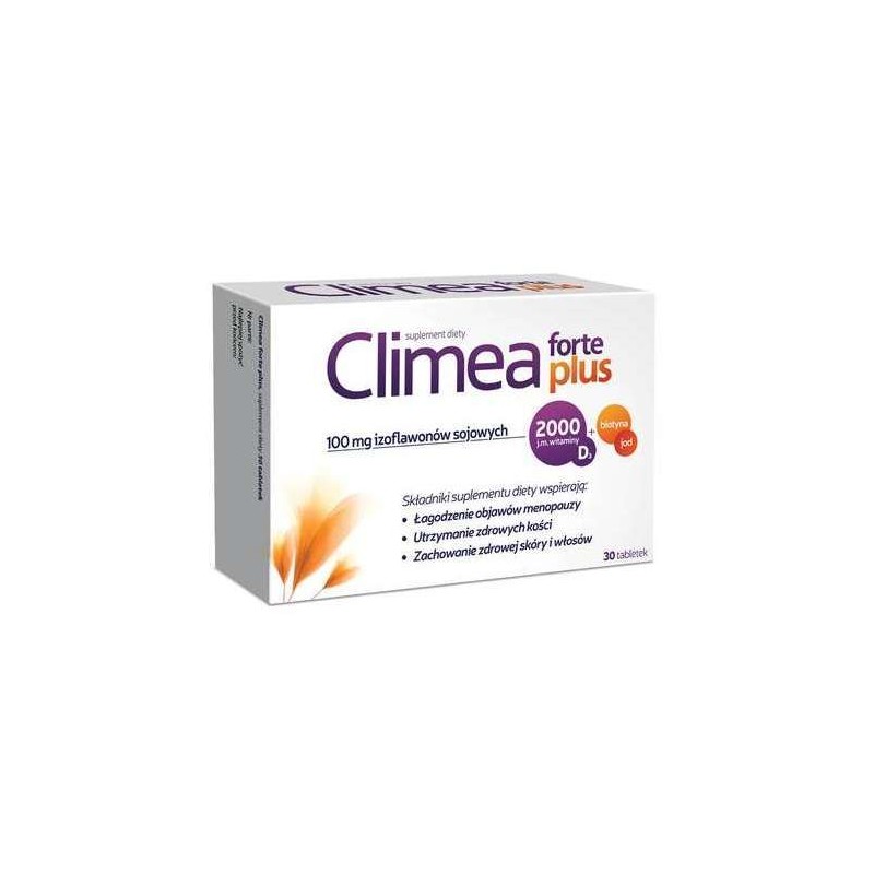 Climea forte plus - suplement diety pomagający w łagodzeniu objawów menopauzy, dodatkowo wzbogacony w biotynę i jod. Produkt przeznaczony dla kobiet w okresie menopauzy.