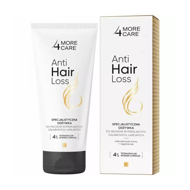 AA More 4 Care Anti Hair Loss Odżywka specjalistyczna Włosy osłabione wypadające łamliwe 200ml Odżywka od AA chroni włosy przed wypadaniem oraz je wzmacniają i zagęszczają. Kluczowym elementem tej serii jest innowacyjny kompleks 4% TETRAXIDYLUM INTENSE o potwierdzonej naukowo efektywności. Ten kompleks, poprzez stymulację mikrokrążenia, odżywia cebulki włosów i aktywuje uśpione mieszki, co przyczynia się do wydłużenia cyklu życia włosów i zapobiega ich przedwczesnemu wypadaniu.