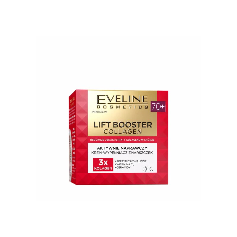 Krem-wypełniacz z serii Lift Booster Collagen to wyjątkowa terapia naprawcza dla skóry dojrzałej po 70. roku życia. Skuteczne składniki aktywne, takie jak: 3 rodzaje kolagenu, witamina Cg, peptydy sygnałowe oraz ceramidy tworzą mieszankę, która wypełni zmarszczki i pozostawi skórę bardziej napiętą. Krem zadba o odpowiednie odżywieni i nawilżenie cery. Jego formuła wymodeluj owal twarzy i zregeneruje zmęczoną skórę. Uelastyczni ją oraz zadba o widoczny efekt odmładzający. Już po pierwszym miesiącu używania!