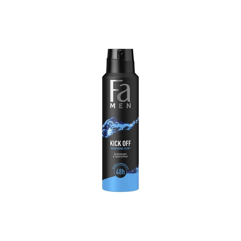 Fa Men Kick Off to dezodorant o orzeźwiającym zapachu, który skutecznie przeciwdziała powstawaniu śladów na ubraniach i chroni przed przykrym zapachem aż do 48 godzin. Produkt nie zawiera soli aluminium.
