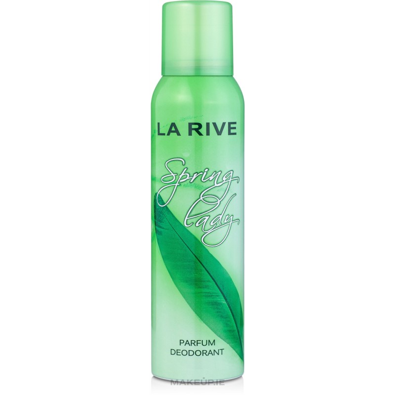 Spring Lady marki La Rive to kwiatowo - zielony dezodorant dla kobiet. Nutami głowy są Cytryna, Bergamotka, Kminek, Rabarbar i Pomarańcza; nutami serca są Zielona herbata, Goździk (przyprawa), Seler, Koper włoski, Mięta i Jaśmin; nutami bazy są Mech dębowy i Biała ambra.