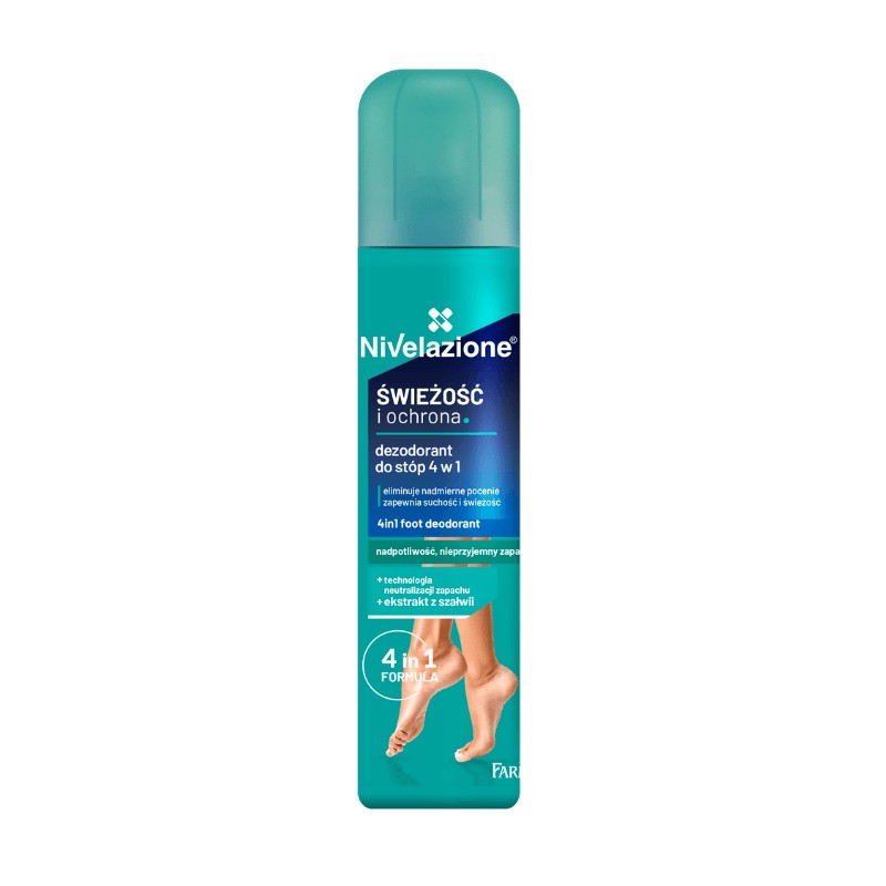Dezodorant do stóp 4 w 1 eliminuje nadmierne pocenie, zapewnia suchość i świeżość, odświeża i neutralizuje nieprzyjemny zapach oraz poprawia komfort i higienę stóp z problemem grzybicy. Działa już od pierwszej aplikacji. Multifunkcyjna formuła dezodorantu o długotrwałym działaniu, dzięki starannie dobranym składnikom aktywnym o wysokiej skuteczności zapewnia niezawodną ochronę, pomaga w zachowaniu odpowiedniej higieny oraz przedłuża świeżość butów i stóp każdego dnia. Skutecznie redukuje nadmierne pocenie, neutralizuje nieprzyjemny zapach potu i zapobiega jego powstawaniu, działa antybakteryjnie oraz błyskawicznie odświeża stopy i obuwie, zapewniając uczucie komfortu już od pierwszej aplikacji. Według 95% badanych* natychmiast odświeża i skutecznie neutralizuje nieprzyjemny zapach, według 92%* badanych regularnie stosowany likwiduje nadmierne pocenie oraz zapewnia komfort i suchość stóp.*testowane na grupie 25 osób