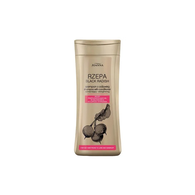 Joanna Rzepa szampon wzmacniający z odżywką do włosów przetłuszczających się, ze skłonnością do łupieżu i wypadania. Problem? Masz włosy przetłuszczająca się, ze skłonnością do łupieżu i wypadania, które potrzebują intensywniejszej pielęgnacji? Szukasz naprawdę skutecznego produktu? Rozwiązanie: szampon wzmacniający z odżywką Rzepa – zawiera zestaw aktywnych składników, takich jak ekstrakt z czarnej rzepy oraz inne specjalnie wyselekcjonowane ekstrakty naturalne i prowitaminę B5, aby zmniejszać przetłuszczanie się skóry głowy i łupież oraz działać wzmacniająco, przeciwłojotokowo i pielęgnująco. Czarna rzepa jest uznawana przez medycynę ludową za jeden z najskuteczniejszych, naturalnych środków wzmacniających i zapobiegających wypadaniu włosów, a dodatek składników kondycjonujących wzmacnia efekt pielęgnacyjny preparatu. Rezultat: dokładnie i skutecznie umyte włosy i skóra głowy; włosy bardziej lśniące, puszyste i pełne życia; łatwiej się rozczesują i układają