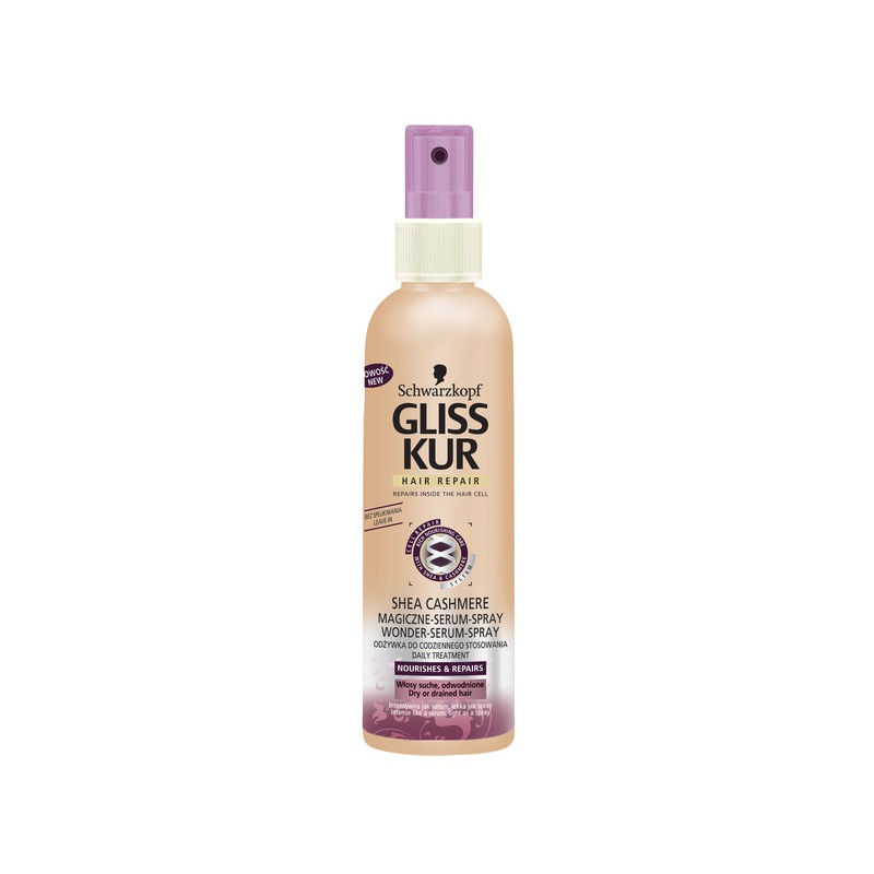 Gliss Kur Shea Cashmere – stworzone specjalnie z myślą o włosach suchych i zniszczonych. Zawierają w swym składzie odżywcze masło Shea, które wnika głęboko w komórki włosa. Dostarczają suchym włosom odpowiednich składników pielęgnujących, pomagając także odbudować włókna, które uległy uszkodzeniu pod wpływem wysokich temperatur - suszarki, żelazka do włosów, czy nawet centralnego ogrzewania - lub odwrotnie – na skutek mrozu. Luksusowe proteiny kaszmiru zapewnią włosom kaszmirową miękkość, zdrowy wygląd i połysk.